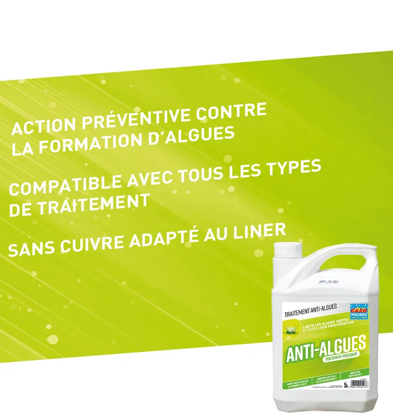Avec le traitement préventif Anti-algues Cash Piscines, évitez la prolifération des algues vertes ne sera plus un souci ! Compatible avec tous les types de traitements, cet algicide aura pour mission de limiter l’apparition et la croissance de ces micros-organismes néfastes pour l’eau de votre piscine. Idéal pour vous prémunir d’une eau verte, ce produit sans cuivre et non moussant viendra compléter le pouvoir de votre désinfectant (chlore, brome, oxygène actif, …) pour conserver une eau cristalline et éviter ainsi toutes déconvenues après des intempéries (orage, pluie, …) ou des fortes chaleurs.