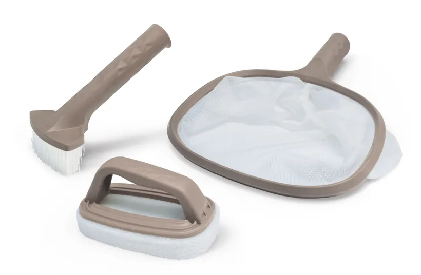 Vous souhaitez prendre soin de votre spa ? Optez pour le kit composé de 3 accessoires essentiels. La brosse, l’épuisette en maille et le tampon à récurer.
