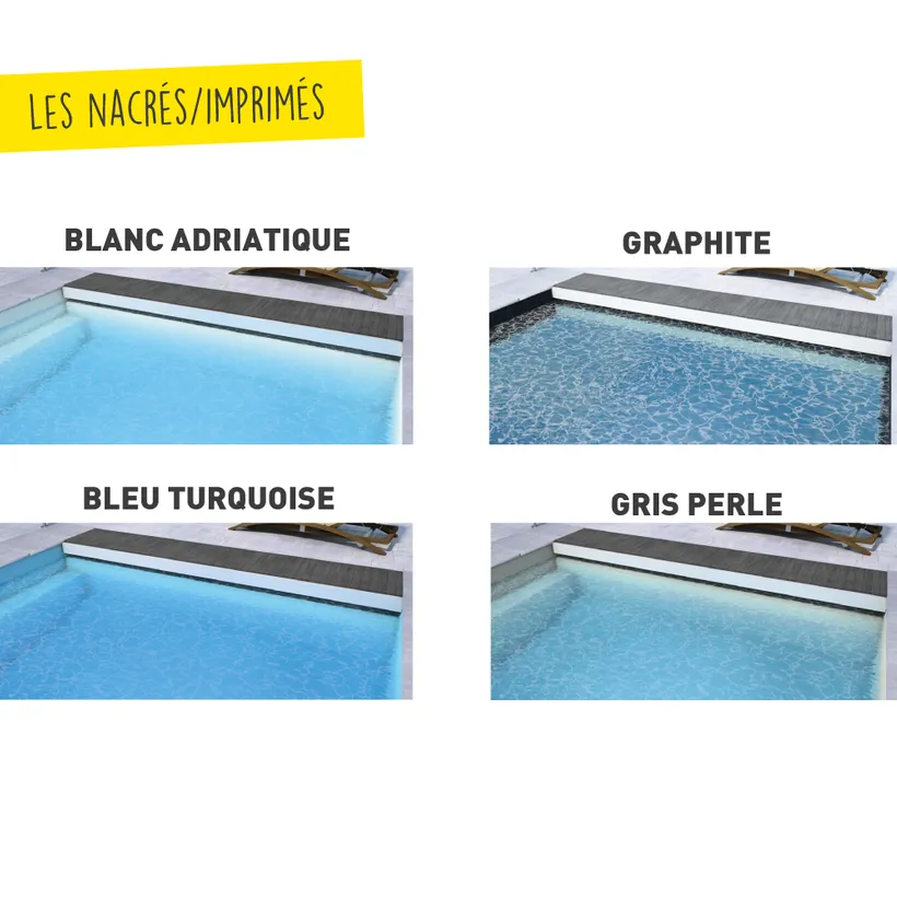 - Les Nacrés/Imprimés, pour une finition parfaite (Blanc adriatique, Bleu turquoise, Graphite, Gris perlé)